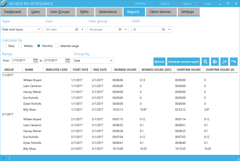 Web interface: attendance view