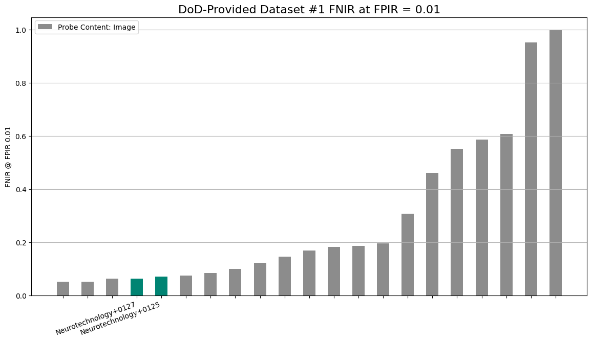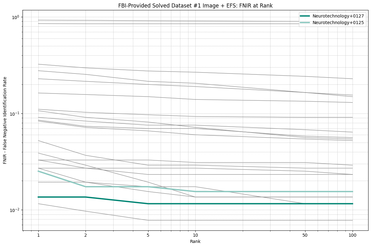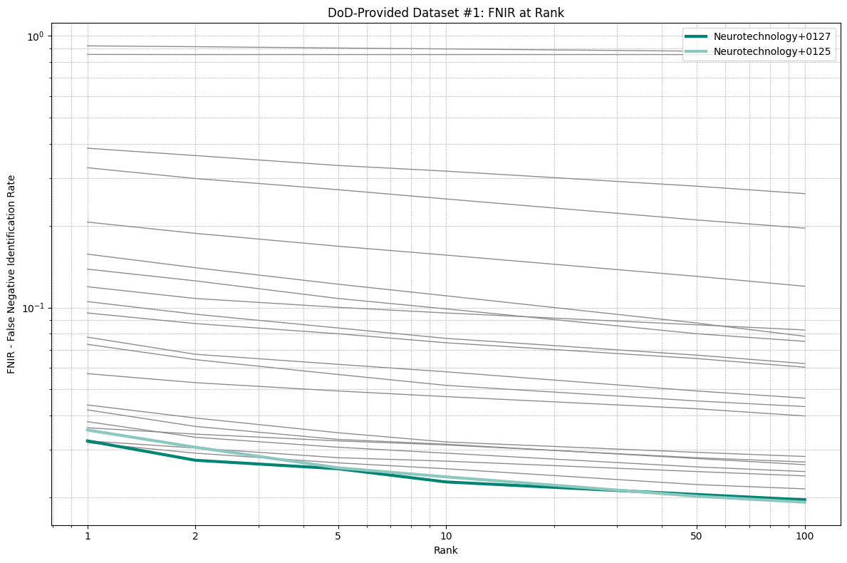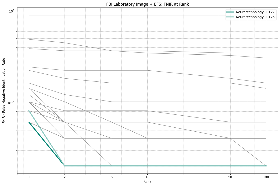 - FNIR @ Rank – False Negative Identification Rate at a given Rank. Representation of a semi-automated mode, where the system provides a list of candidates, and an expert can review up to any number of candidates. The rank indicates how many candidates need to be reviewed, while the FNIR shows the percentage of missed identifications. This metric is also called "Investigation".