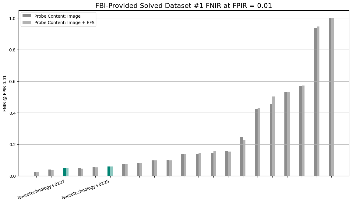 Evaluation results of the latest algorithm submission, Neurotechnology+0127, and the previous submission, Neurotechnology+0125, are provided below for each testing scenario with specific datasets. The analysis follows the same principles as NIST results reporting, showing only the best-performing submission from each vendor and highlighting the differences between algorithm providers.