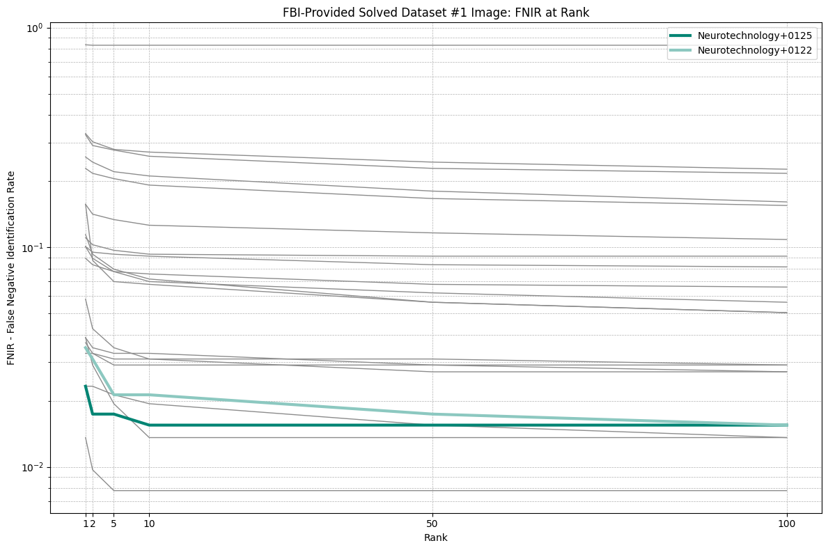 - FNIR @ Rank – False Negative Identification Rate at a given Rank. Representation of a semi-automated mode, where the system provides a list of candidates, and an expert can review up to any number of candidates. The rank indicates how many candidates need to be reviewed, while the FNIR shows the percentage of missed identifications. This metric is also called "Investigation".