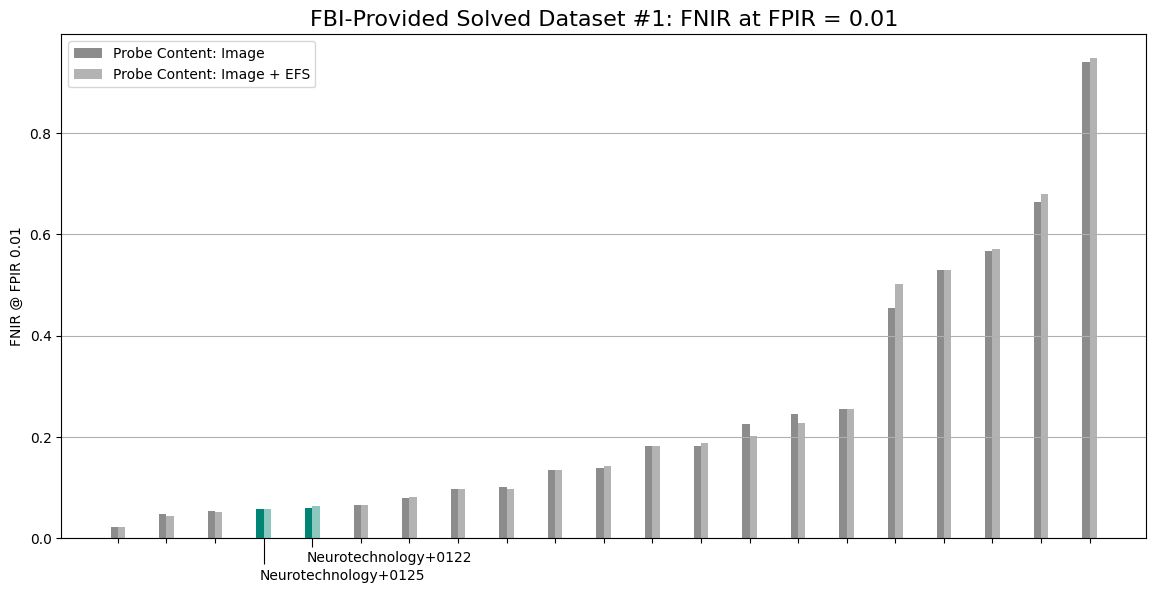 Evaluation results of the latest algorithm submission, Neurotechnology+0125, and the previous submission, Neurotechnology+0122, are provided below for each testing scenario with specific datasets. The analysis follows the same principles as NIST results reporting, showing only the best-performing submission from each vendor and highlighting the differences between algorithm providers.