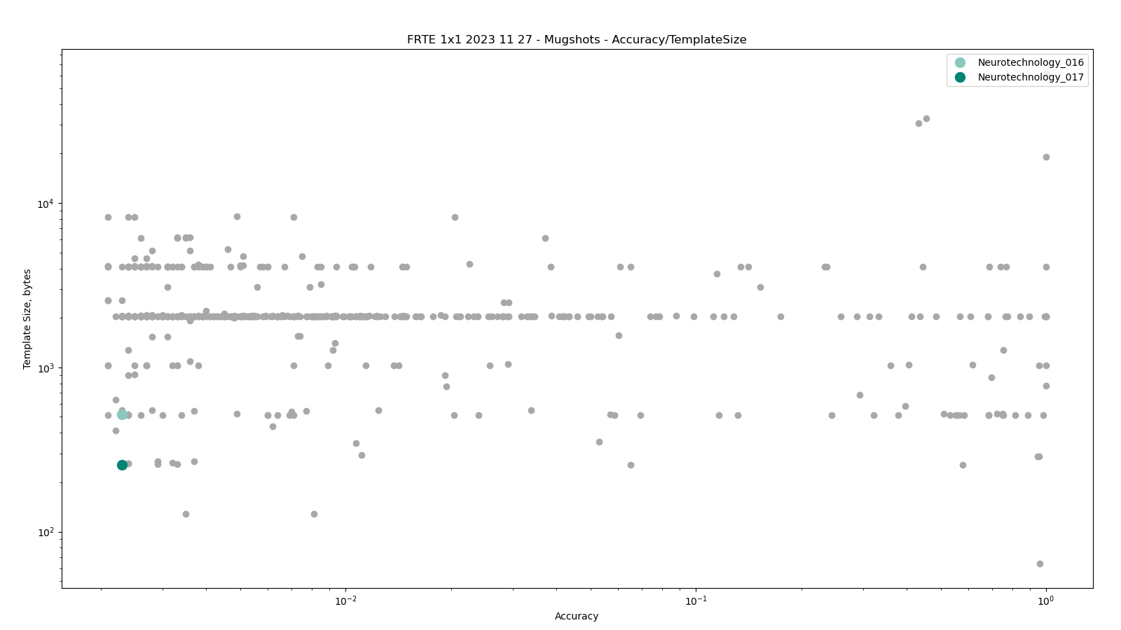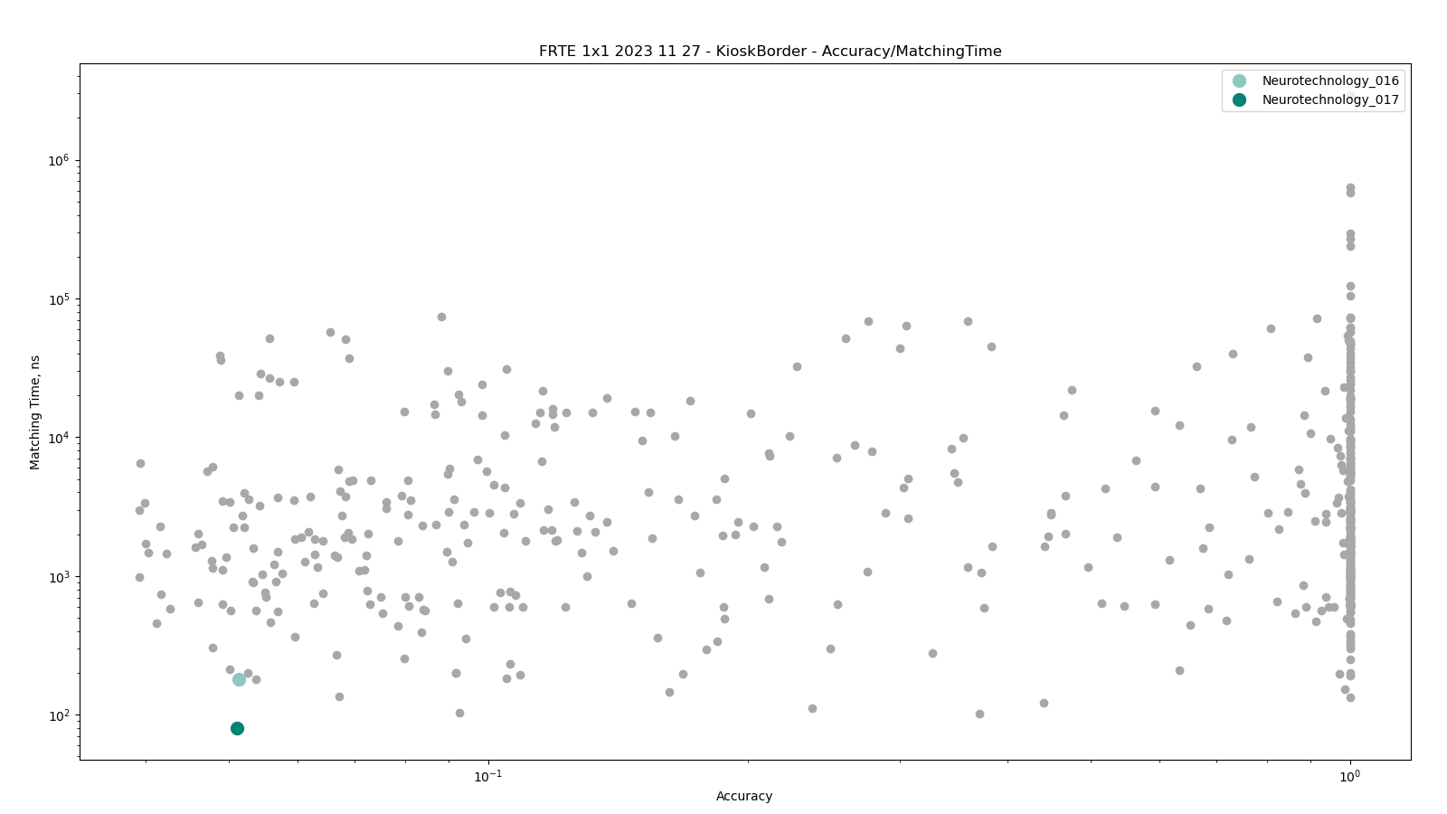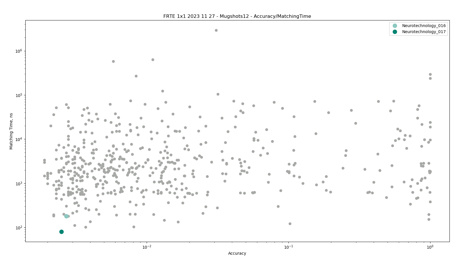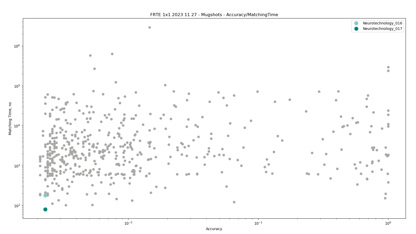 The charts below show the accuracy of all tested algorithms, with the highlighted dots corresponding to the Neurotechnology algorithm submissions.