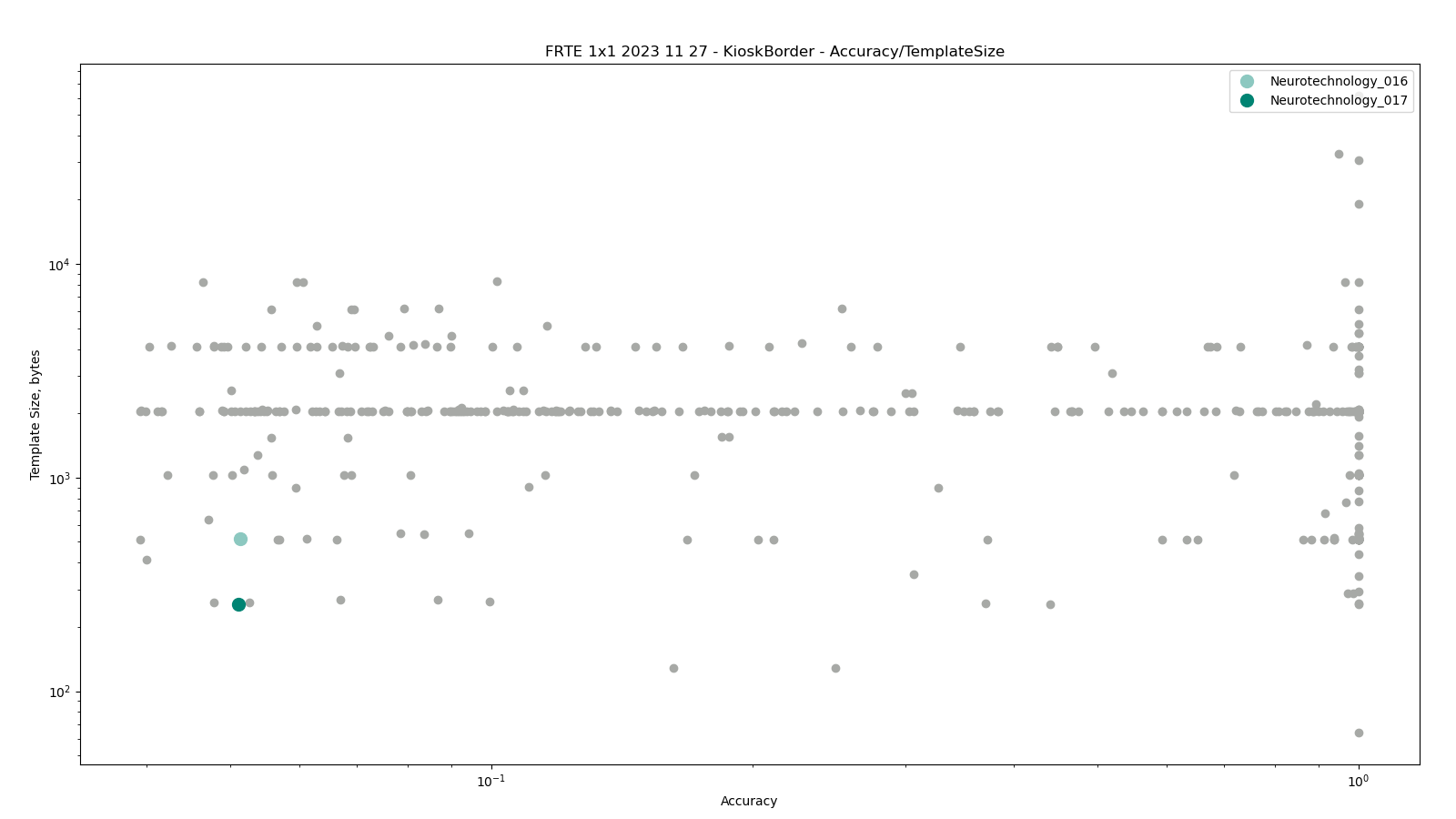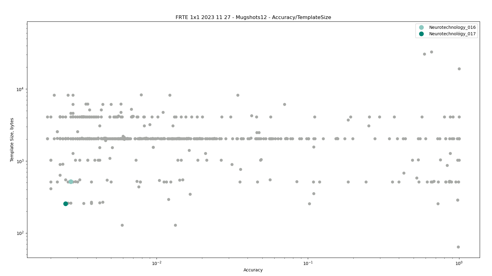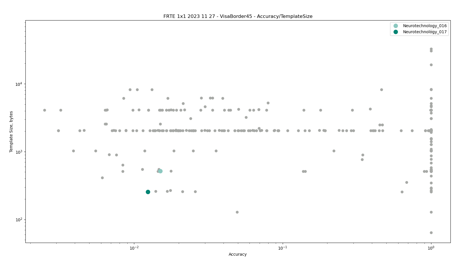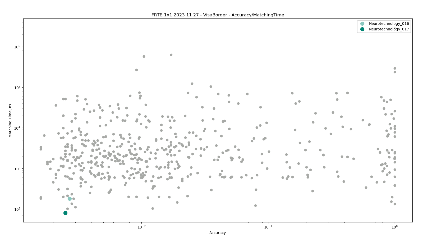 The charts below show the accuracy of all tested algorithms, with the highlighted dots corresponding to the Neurotechnology algorithm submissions.