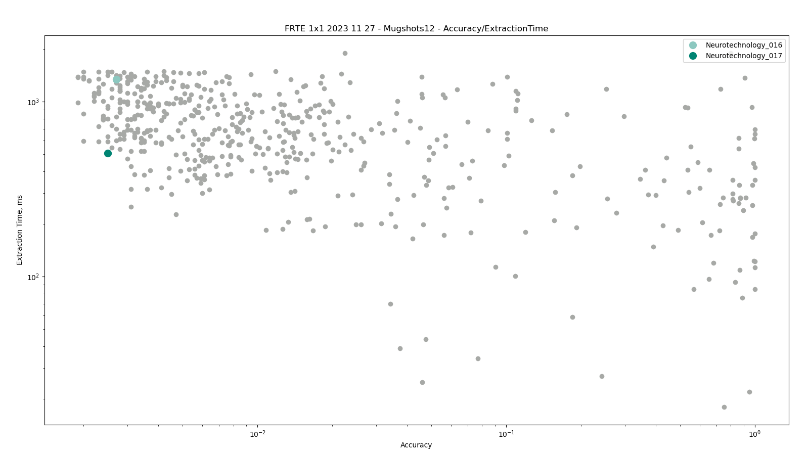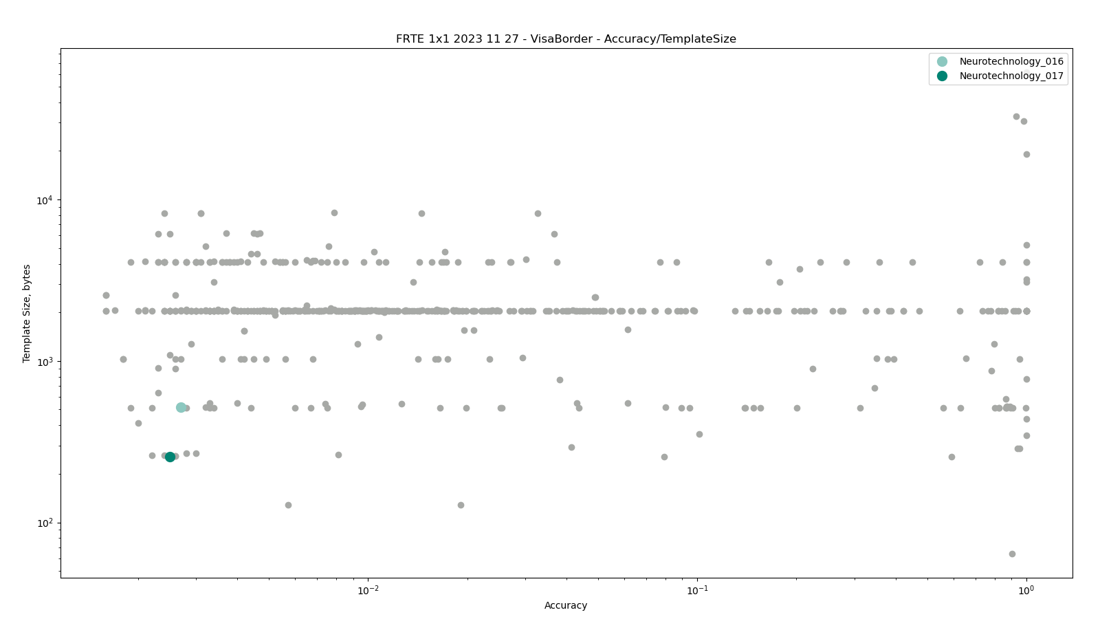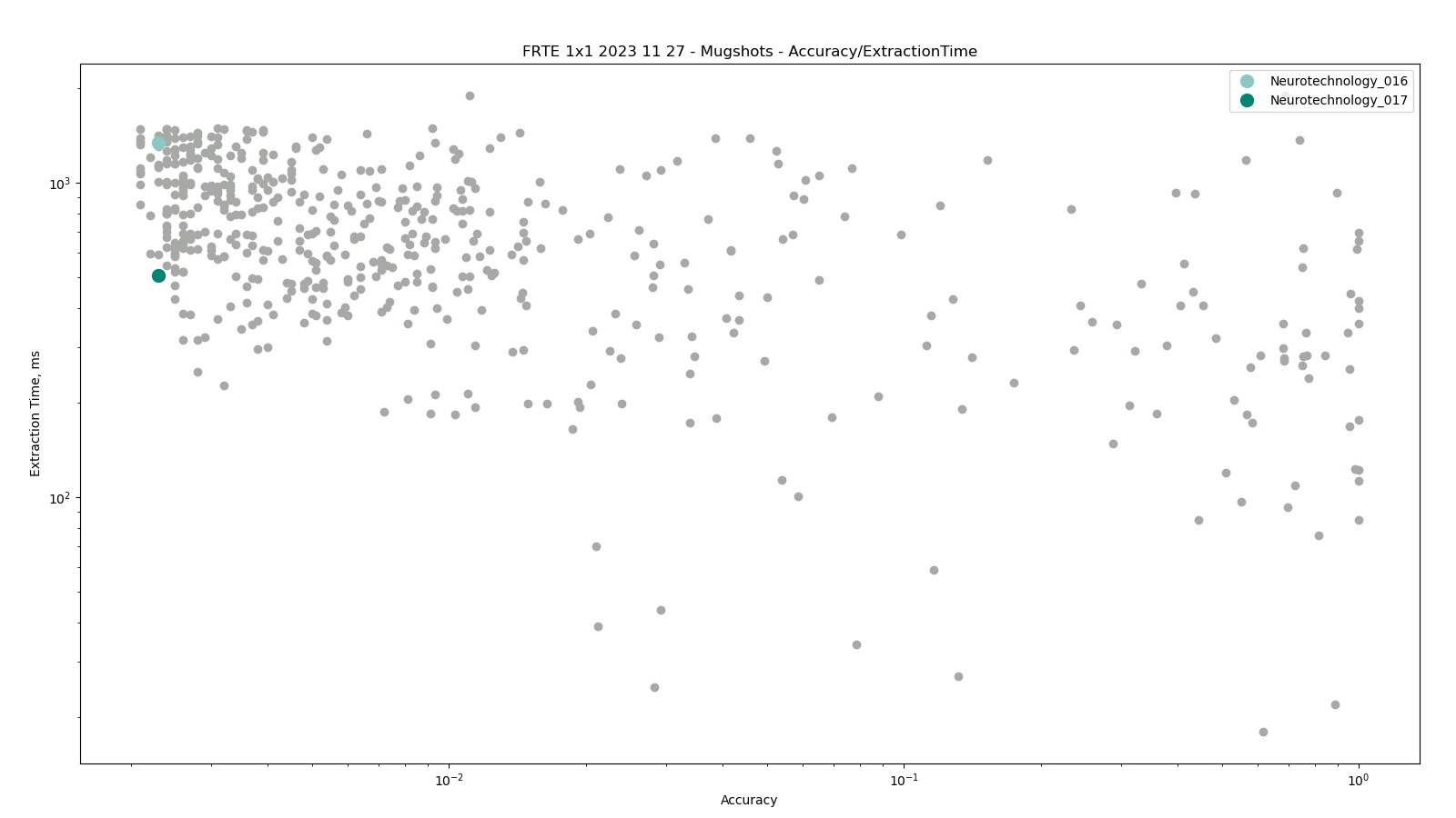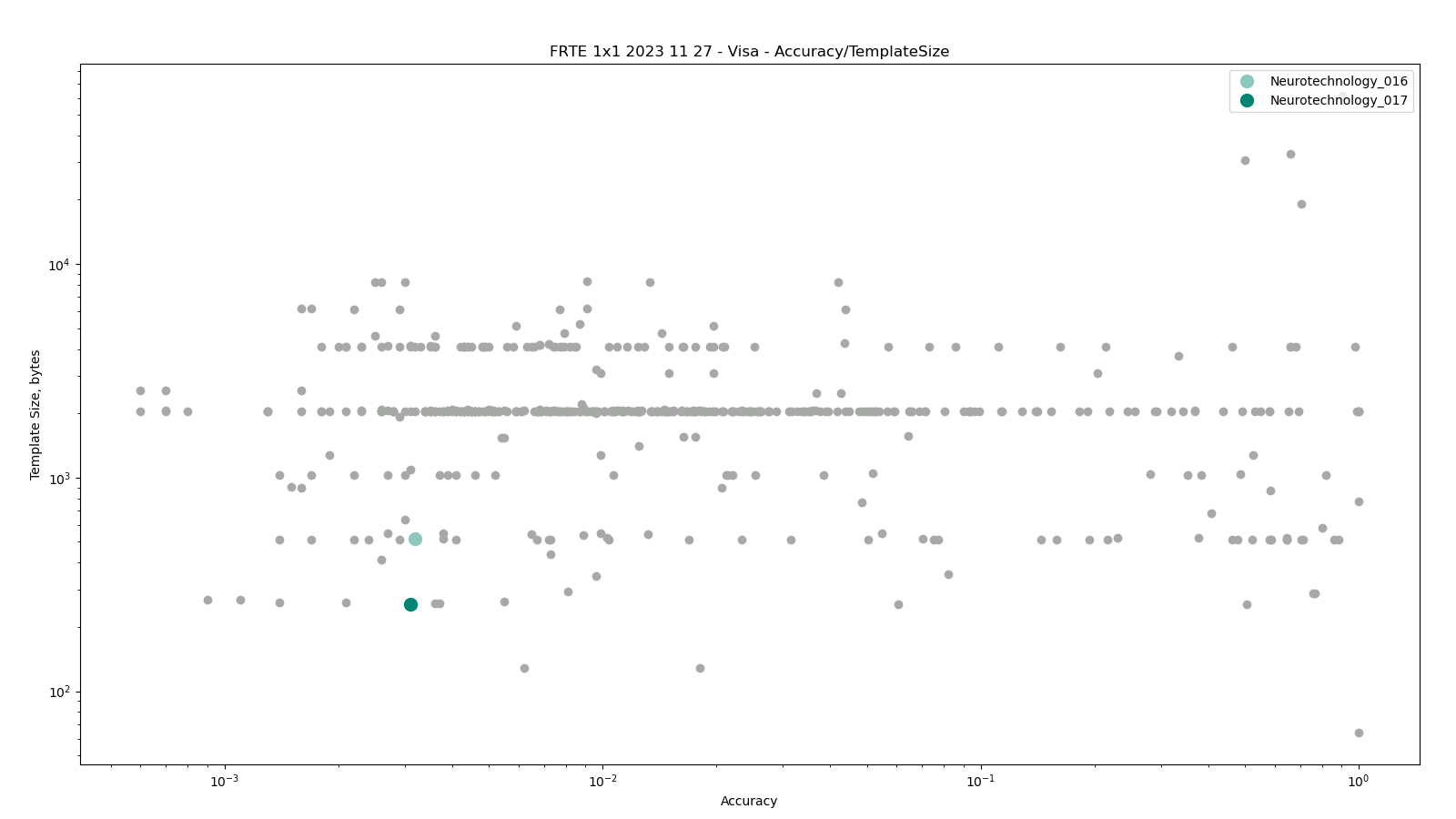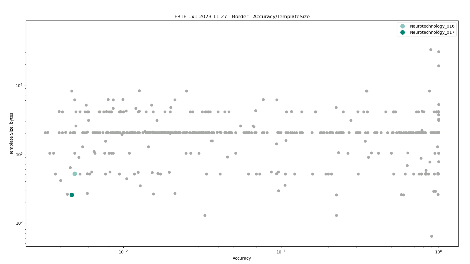 The charts below show the accuracy of all tested algorithms, with the highlighted dots corresponding to the Neurotechnology algorithm submissions.