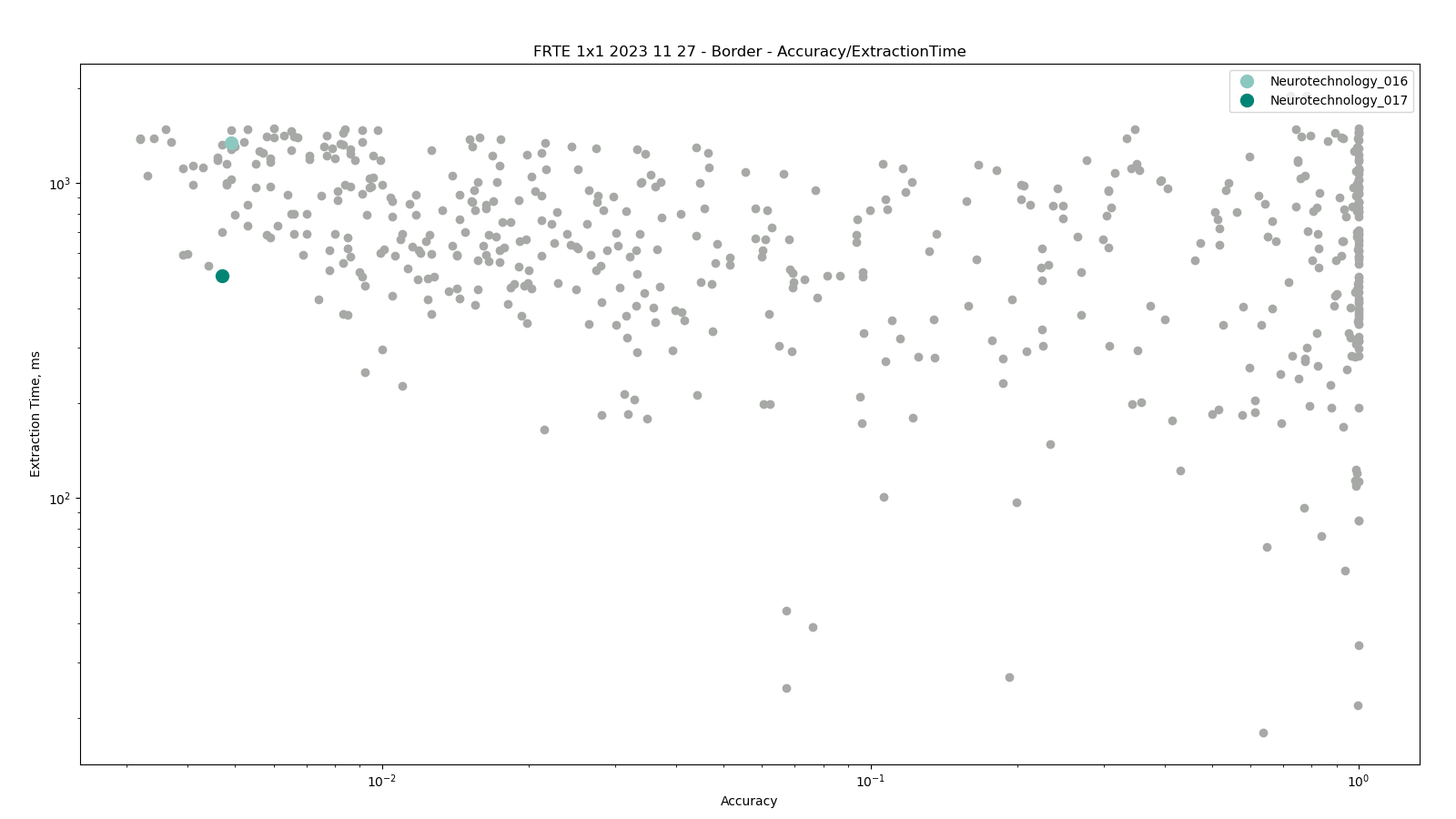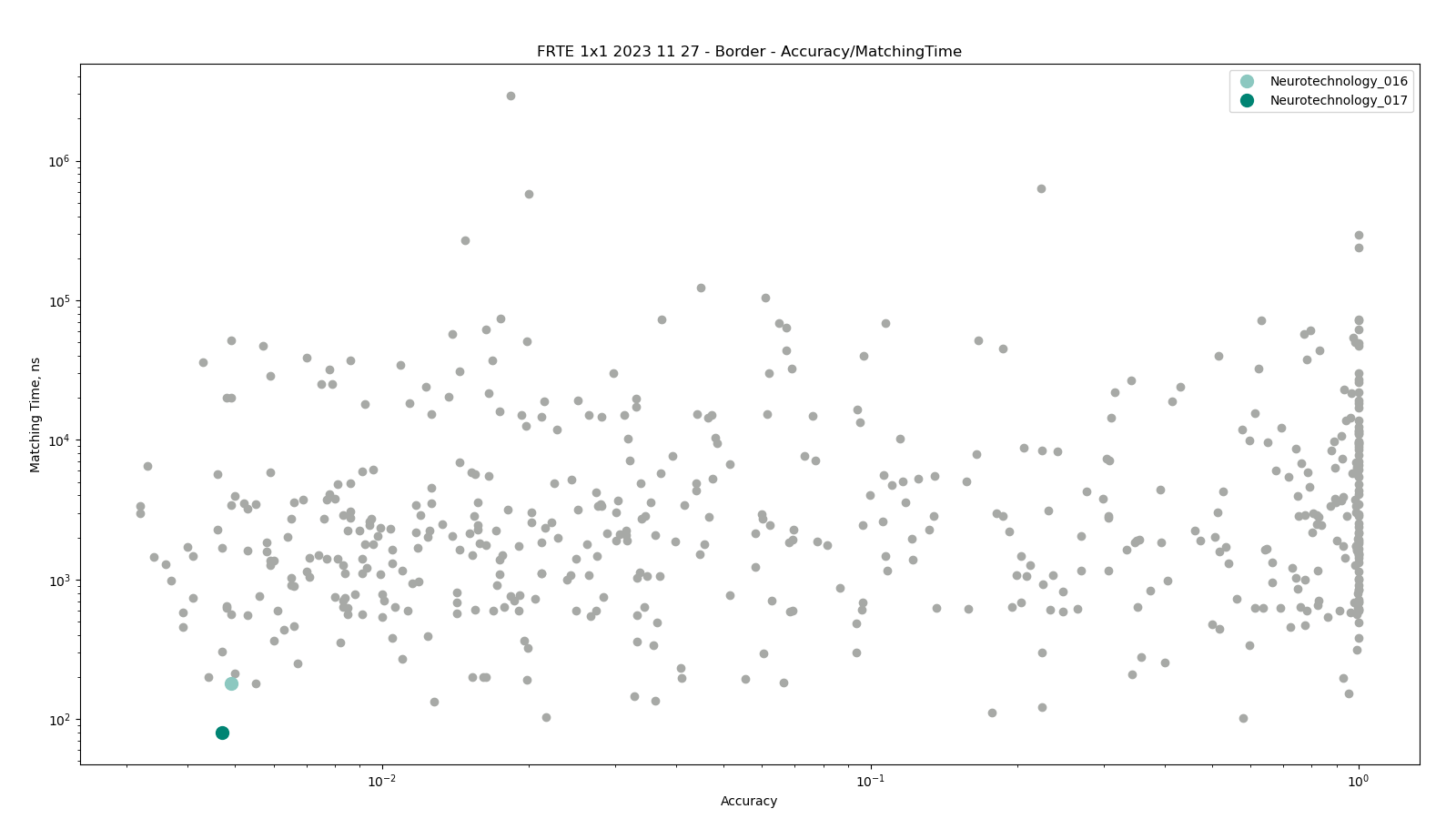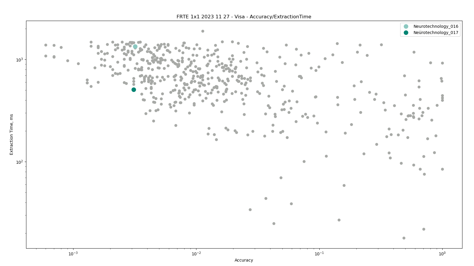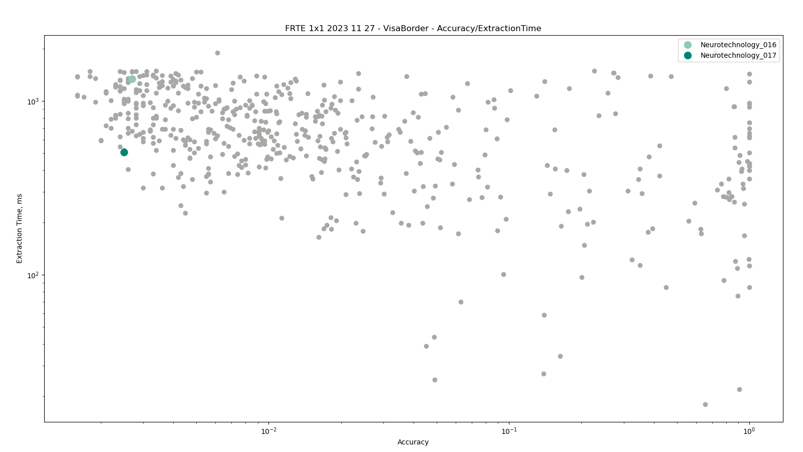 The charts below show the accuracy of all tested algorithms, with the highlighted dots corresponding to the Neurotechnology algorithm submissions.