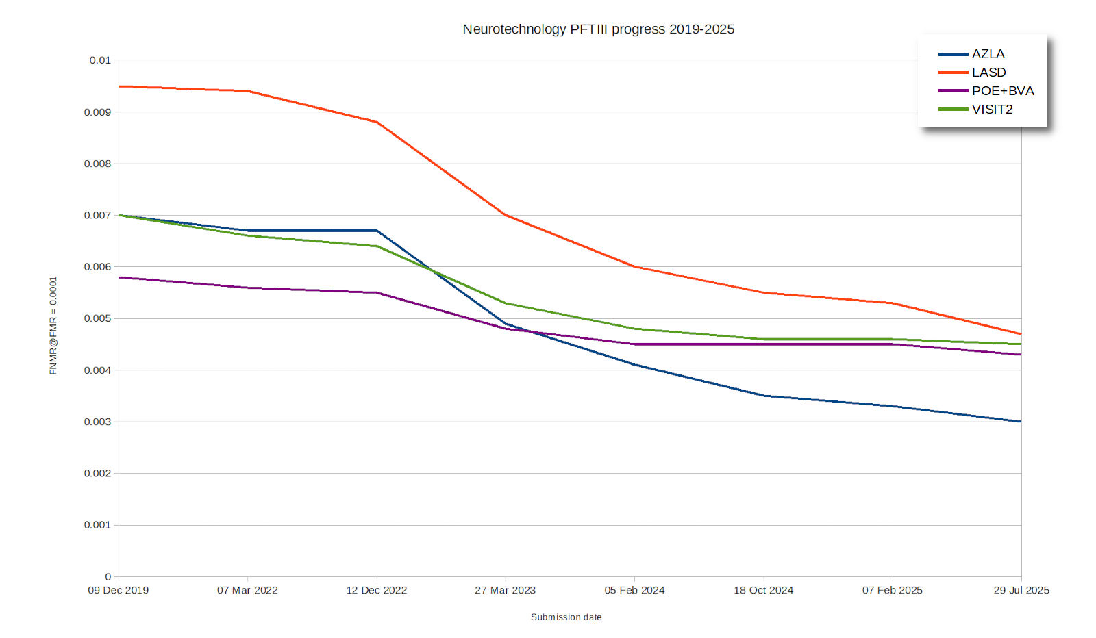The chart illustrates how our algorithm submissions consistently improved results across all datasets since 2019. The accuracies of all submissions are shown as False Non-Match Rate at the fixed 0.0001 False Match Rate.