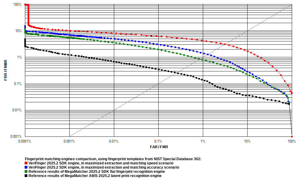 - Test 3 shows the reliability of the MegaMatcher 2025.2 SDK flat fingerprint recognition engine. The reliability of the engine in this test is shown as the green curve on the ROC chart. MegaMatcher is designed for large-scale AFIS and multi-biometric systems, which operate with larger biometric databses and require higher level of matching accuracy. VeriFinger 2025.2 SDK customers can contact us for more details about upgrading to MegaMatcher 2025.2 SDK.