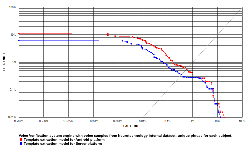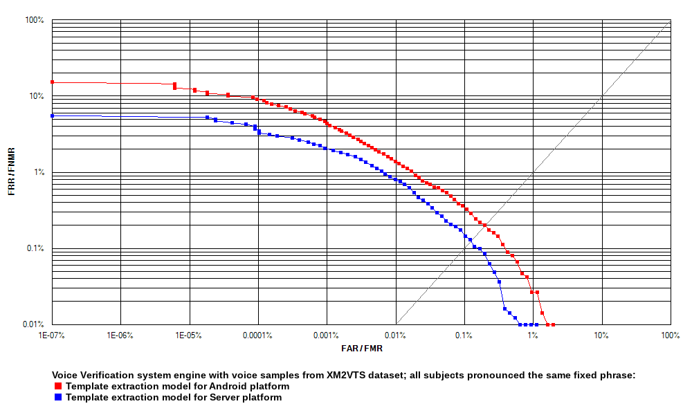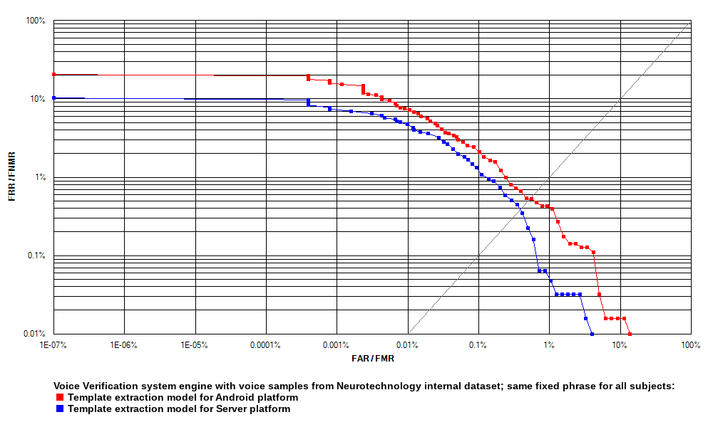 The Voice Verification system template matching algorithm has been tested with voice samples taken from the XM2VTS Database, as well as with voice samples from Neurotechnology's internal dataset. Two datasets included fixed phrases pronounced by all subjects within a particular dataset, and one dataset included unique phrases for each subject.